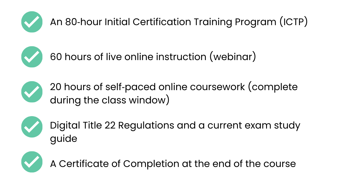 Digital Title 22 Regulations, an exam study guide, and your Certificate of Completion.